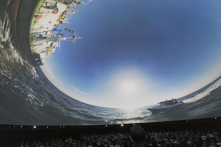 Gemeinsam mit den Wissenschaftlerinnen und Wissenschaftlern war ein Kamerateam an Bord des Zeppelins, das die rasante Jagd auf die Meereswirbel mit innovativer 360°-Technologie filmte. Auch auf den Forschungsschiffen waren Kameras dabei und Drohnen begleiteten die Expedition. Daraus entstand der 30-minütige Full-Dome-Film „Die Wirbeljagd“, der Planetarien bundesweit kostenlos zur Verfügung gestellt wird. Zuschauerinnen und Zuschauer können so einen Messtag aus der Perspektive der Forschenden unmittelbar miterleben – das ist in dieser Form bislang einmalig. Meeresforschung wird wissenschaftlichen Laien mit dem Film auf eindrucksvolle und spannende Weise kommuniziert.