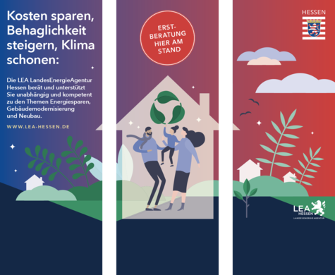 Energetische Sanierung ist ein wichtiger Baustein hin zu mehr Klimaschutz. Deshalb sind Berater*innen der LEA Hessen ganzjährig auf Bau- und Gebäudemessen präsent. Zwischen vor allem kommerziellen Anbietern bietet die LEA Hessen als kostenfreie und unabhängige Beraterin ein Alleinstellungsmerkmal. Dieses herauszustellen und im Messetrubel aufzufallen, war Auftrag bei der Neugestaltung von Roll-ups zum Thema Gebäudesanierung. Auch hier griff das Kreativteam von KOMPAKTMEDIEN zu Illustrationen und schuf für die LEA Hessen echte Hingucker.