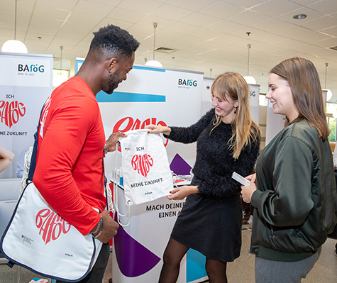 Die BAföG-Infotour in 28 Universitäts- und Fachhochschulstädten deutschlandweit vom 14. Oktober bis zum 4. November 2019 war ein weiterer Höhepunkt. Promotionteams machten Studierende auf dem Campus ihrer Hochschule auf die Verbesserungen bei der BAföG-Förderung aufmerksam und verteilten BAföG Give-aways. Beraterinnen und Berater der Studenten- und Studierendenwerke vor Ort boten am BAföG-Stand in der Mensa Fachinformationen. Ausgewählte Tourstopps wurden von einem Fotografen begleitet und Impressionen der Tour auf das-neue-bafög.de publiziert. Auf den BAföG-Touren 2021 und 2022 wurde an die Erfolge angeknüpft.